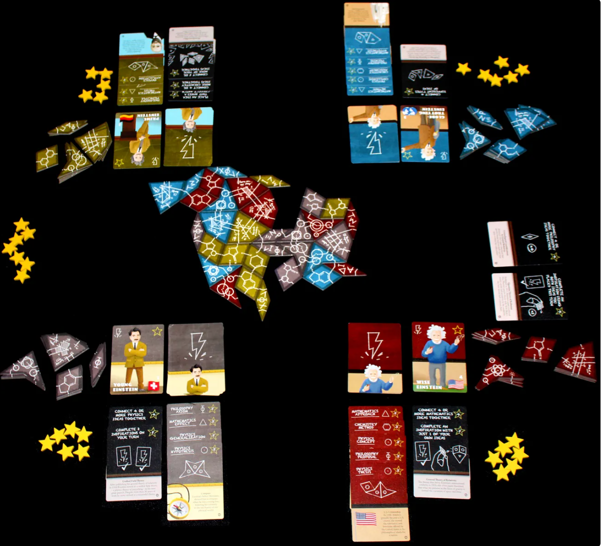 Each Einstein has their own deck of Inspiration Cards based on the real happenings of his life. These inspirations give you simple theories to complete. Using ideas from four different branches of science - physics, mathematics, chemistry, and philosophy - represented by four shapes, each Einstein places tiles representing their ideas onto an emergent common board. Players get points for completing their own theories, contributing to the theories of other players, and helping to finish major theories from Einstein's life.