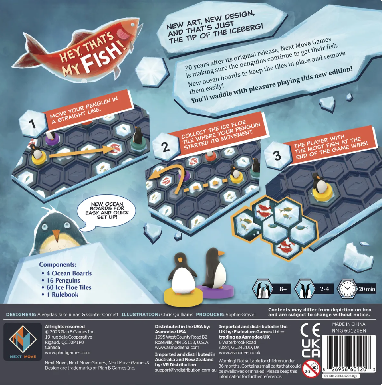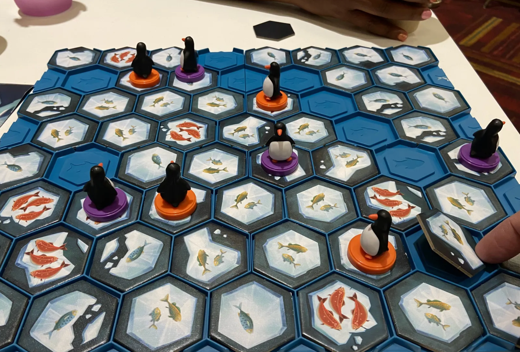 In Hey, That's My FISH!, players take turns moving one of their penguins in a straight line collecting the tile (with all its fish) they started on. Whoever has gathered the most fish at the end of the game wins. Sounds easy, but as the ice disappears, it gets harder and harder for penguins to find fish to feed on.
