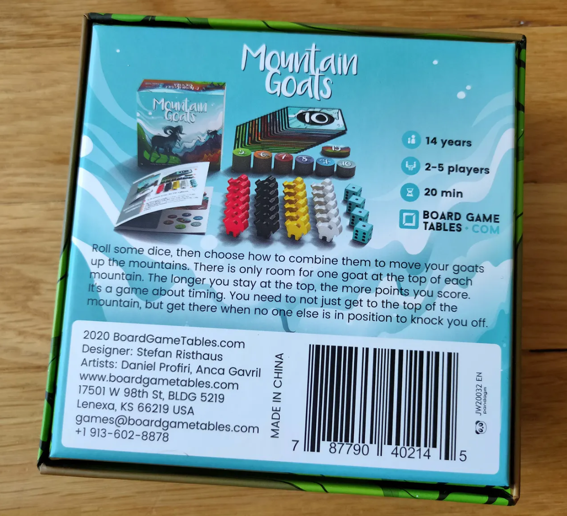 In Mountain Goats you work to move your goats to the top of 6 different mountains where they can score points as long as they stay there. You can share spaces with other goats on the way up, but there is only room for one goat at the top of each mountain. If someone else's goat moves to the mountain top, they will kick you off and you'll have to start your trek over.