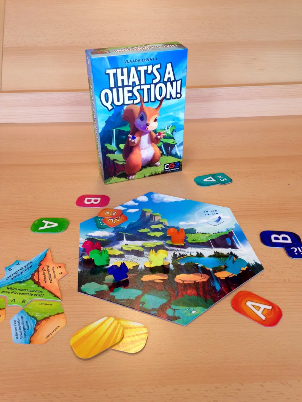 You will get to think about interesting stuff, and yo'll also learn new things about your friends - deep, important things like how much they love pizza. And you get to keep score by moving little wooden squirrels up a mountain. Why squirrels? That's a question!
