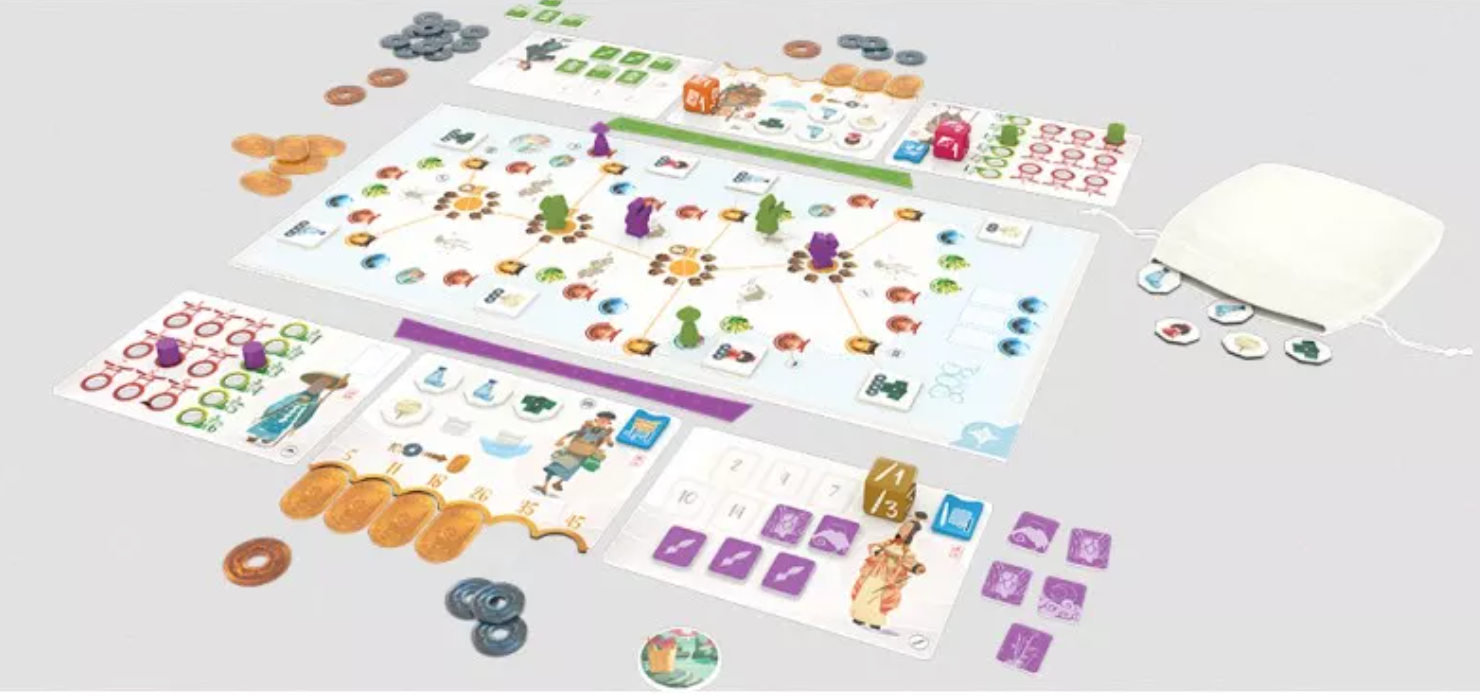 Welcome, travelers, to the Japanese island of Shikoku! Tokaido Duo is a standalone game inspired by Tokaido but featuring completely new mechanisms. 1-2 players use a quick dice draft each turn to steer three unique characters on different tracks around the smallest of Japan’s main islands.