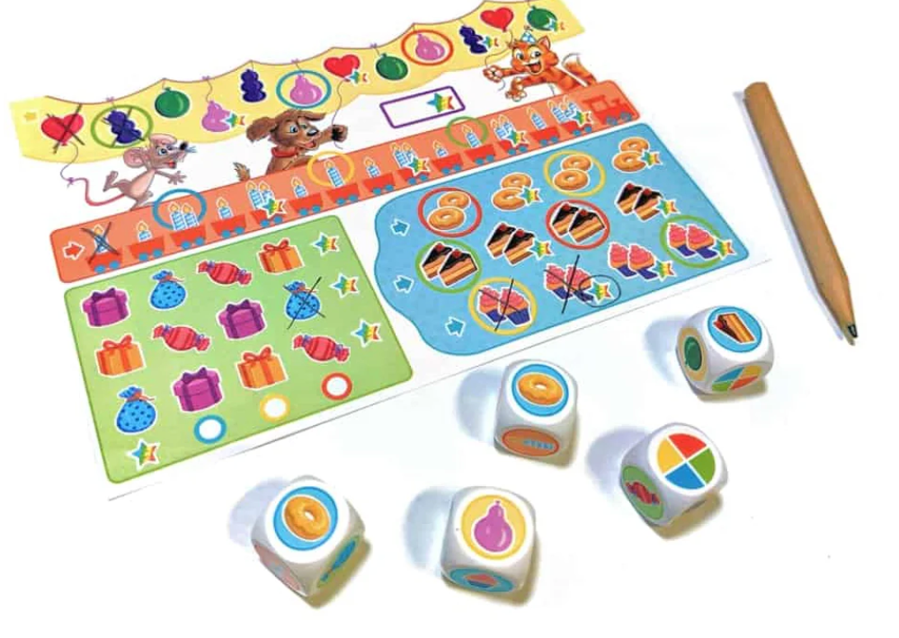 What an amazing party - with balloons, candles, presents, and plenty of cake. There's something to please everyone! Players who cleverly cross out the rolled symbols will collect lots of points and bonuses. But watch out! All of the dice that you don't use can be used by your fellow players. That means everyone gets to play and no one has to wait around.